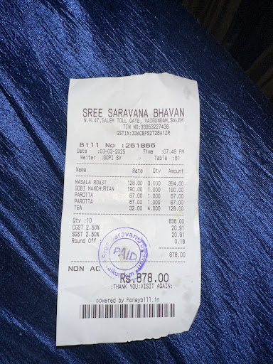 Worthless!!!…Not the original Saravana bhavan and the prize is very high.They didn’t even provide the menu or let us know about anything like combo stuffs.I ordered 2 normal porotta and I only got 1 porotta after waiting a while.I double check the order and he said the 2nd one is getting ready .It’s all fine for me cause sometimes it’s happen but it really sucks when I got the bill.They charge me ₹67 for just 1 porotta .I check with the manager and they are not willing to clarify or double check with anything.So guys make sure you are getting menu and check the menu before ordering anything.