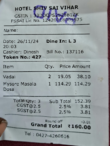 Read moreToday I got a chance to go to Hotel Shiv Sai Vihar for dinner. The Ambience and Hospitality was really very good. Also very happy to see woman employees and the way they talk to the customers was very polite and soothing. The taste of crispy rava dosa, spring rolls and especially the mini sambar idly taste was out of the world. We have become a big fan of this hotel. Quality of the food is damn good and homely with surprising nominal rates. Heartiest wishes for a big success and a bright...