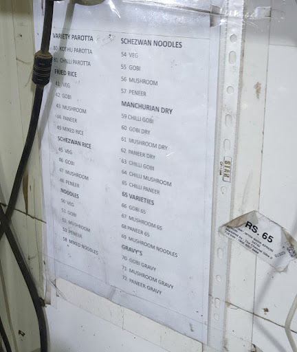 Idly 12.5Rs per piece Idiyappam 12.5Rs per piece Dosa 40 Podi Dosa 50 Chappathi 2pcs 35 Parota 2pcs 50 Veg. Fried rice 90Rs Gobi Manchurian 130Rs Chappati 25Rs per piece