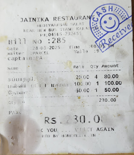 Read moreI recently visited Jainika Restaurant and had a pleasant experience overall. If you’re looking for a budget-friendly place that serves tasty South Indian food, this is definitely a spot worth trying. The pricing is quite economical, which makes it a great option for regular breakfast and dinner outings, especially if you’re in the area.