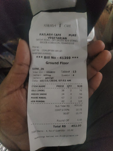 ย ย ย Read moreOne of the top pure vegetarian restaurants in Erode is Kailash Cafe, where you may satisfy all of your vegetarian needs. We recently ordered a few things, and the highlight dish was the Erra Karam Dosa, an Andhra delicacy that we really enjoyed. Our order was for takeout, so I was a little concerned about the quality of the wrapping, but they showed me incorrect and our stuff was carefully packed. Delicious cuisine and a kind staff. We are grateful to Kailash Cafe for making our meal experience...