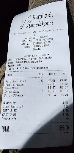 Read moreIf there’s one place that knows how to blend tradition with taste, it’s Karaikudi Annalakshmi Hotel. From the moment you step in, the aroma of freshly ground spices, sizzling tavas, and slow-simmering gravies welcomes you like an old friend. The ambience may be modest, but what truly steals the show is what lands on your plate. Every bite brings out layers of flavor — from earthy spices to nostalgic home-style notes — that remind you of a time when food was made with both technique and heart.