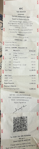 Read moreToday bought Burger (5) and hot & Crispy Chicken (12) from KFC Perumbakkam, it tasted really very very bad. I believe they haven’t changed the oil or it may be very old preserved chicken or some other reason but the chicken tasted bitter and the oil was too bad flavour. Definitely if someone has bad gut then it will be food poison even I don’t know what will be the situation for my family tomorrow by having this food . This is really unacceptable as they charge very good amount then why they can’t provide good food for customer. If KFC is not taking or inspecting this outlet soon it will be under bad situation and bad credit for KFC. Really very very very bad food , after eating one piece we realised and we just threw it by scaring whether something may happen!!!! Please be cautious in serving people...