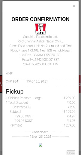 Read moreIf you’re craving a salty surprise, this KFC branch might just deliver - literally. After a not-so-great experience earlier, I had opted to dine at the Taco Bell next door. Still tempted by the classic popcorn chicken, we ordered a large takeaway from KFC before leaving. A few hundred meters away, once the food cooled down a bit, we tried the popcorn. It was too salty - so much so that it completely masked the chicken flavor. It was inedible and we ended up throwing it away. I raised a complaint through KFC’s official helpline and was told the store manager would get in touch. But no one has called back. Disappointing food is one thing, but lack of follow-up shows how much (or little) KFC value...