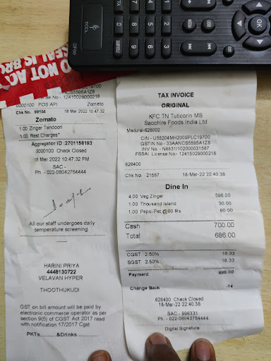 Read morecheck number 25642. I have ordered 2 piece hot wings of 2 numbers. Once we received the wings it is very small which doesnt looms like a chicken but like a chick. Extremely dissatisfied with that. Also they asked for the mobile number for the order but i havent received message as well for the corresponding order. After checking with the employee they infor.ed the manager and they said that one of the package which they received has a small cut which got served to us wrongly. I informed that while serving none of the employee are worried to check the size and quality of the wings. Totally disappointed with the Tuticorin KFC branch. Expected the standards as like other branches but tuty KFC failed to meet the expectations and completely...