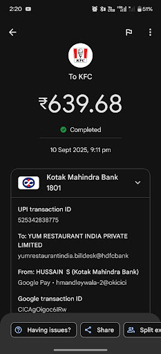 Read moreFirst time hearing from 15yrs of kfc experience there is no zinger box.only bucket chicken only available. Taste of fried chick aweful. No tenderness no juicy. taste like countrychicken coated with flour. Generally i feel aroma of kfc chicken on outside of kfc.. In this place covered with stale contominated rot meat like local market...no water bottle to drink even i pay also.. Network issue from morning itself..for gift vouchers redemption counter staff.. I amazed how ur peoples are doing billing without network..combination of pepsi not available. Rice bowl is like firebowl no taste only salt and spicy too heavy we wasted 2rice bowls which was bought for kids.keep away. Really very bad experience in kfc..in my life time. Waste of money mood spoiled..there is no logic about wall post.which deserved if you didnt feel taste return it. .....after taste the food returning back is not good attitude. My ethics will...