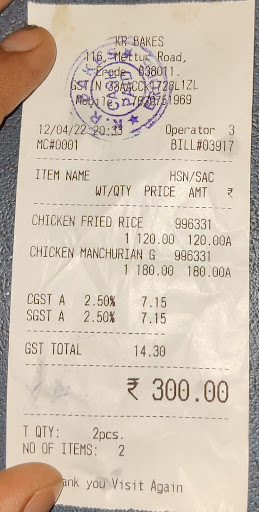 Read moreI ate one chicken rice and one chicken Manchurian on 12.04.2022 at KR Bakes and restaurant. 1 . Chicken rice was priced at 120 made with day before leftover chicken grill pieces which can be randomly found in it and few pieces of egg Chicken Manchurian was very sweety and stale chicken cubes Very bad experience please don't eat in this hotel Either drink tea or cubes and small items in this shop . Don't go for restaurant food only prefer...