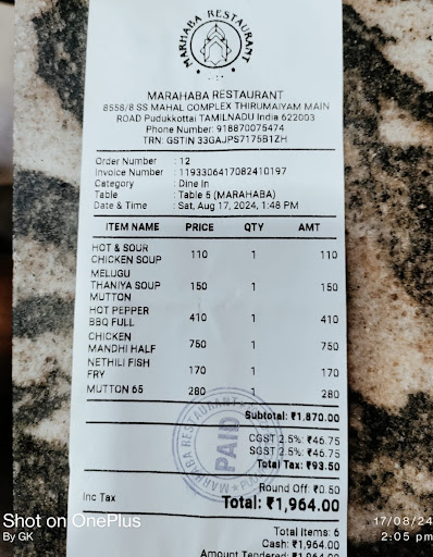 Even though there were more than 10 people, they only turned on one of the three AC units. The Pepper BBQ was overly marinated in oil, making it more like a gravy than a proper BBQ, which I've never seen before. We ordered chicken mandi rice, but instead, we were served a veg pulao with tandoori chicken. The nethili fry was bland and lacked salt.