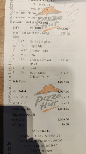 Read moreIf you have never had a bad customer experience, this is the spot. You will be treated like a beggar who is come in for scraps. Only small they said, we ordered a premium pizza and it had 3 pieces of chicken on the entire 4 slices. My friend was saying we could literally get 2 full biryanis at this price. The pasta, it was given in a Togo aluminium box when we are dining in. Seems to have been a canceled take away, the pasta was dry and the Taste was yuck. Also, I could easily count to 4 slices chicken sausage pieces. As many reviews previously mentioned, “NO TISSUES”. Also, the tables are not cleaned unless a customer takes a seat so you can dirty plates on the table for hours. It just kills the ambience If you reading this review, see the other recent reviews and notice note Pizza Hut does not actually take any remedial actions but a canned response to a reviews. Pizza Hut, a place to taste bad...