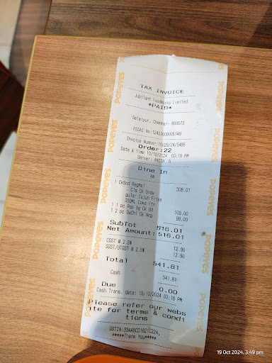 During a recent visit to Phoenix Mall, Chennai, I had the opportunity to dine at Popeyes, a well-known name in the world of fried chicken. True to its global reputation, Popeyes offers a menu centered around crispy fried chicken and a variety of sidesâsimilar in style to other prominent chains in this segment. However, Popeyes brings its own unique twist to the flavor profile, which certainly adds a distinct character to the overall experience.