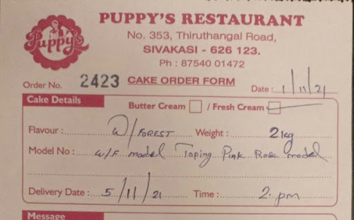 Read moreVery much disappointed with puppy’s bakery.. I ordered cake for the bday party with some photos on it... but cake was not coming well as expected and couldn’t able to cut the take even .. they are not taking care of what we order .. and they don’t mention prizes for cake they ll think and tell us whatever they have in their mind at the moment . Not worth fir Money .. I invested lakhs of money fir the celebration but puppy’s cake was not coming as expected .. in thermacol they pasted the photos. Pls understand the customer requirement and do the customisation .. kadamaiku nu panathennga.. that chef is not even hearing our words he simply tell the other person that take the bill from him and gone away ... don’t disappoint us in the party time .. I definitely won’t refer my friends and relatives .. not worth...