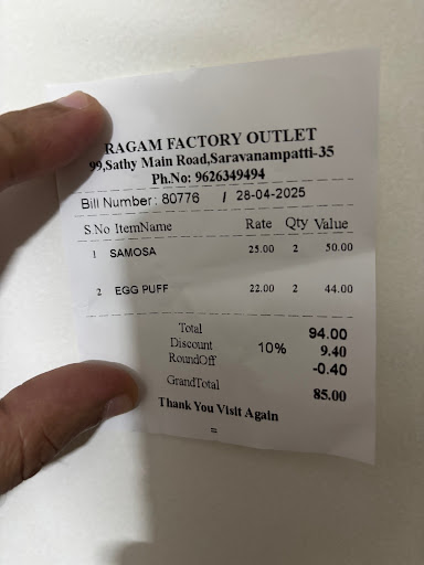 Read moreEven though its a factory outlet.. not may items are available and the menu s seemed to be limited and the freshness of product are little bit questionable...Employees are polite and attentive...Being a big chain of business in CBE...Little more care can be given to this establishment as a factory outlet for improving the quality and quantity on variety of baked, savoury and sweets items...
