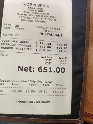 Read moreWe had lunch on January 17, 2025 at Rice n Spice at Rayas Grand. It is one of the worst restaurant in Kumbakonam. The quality of food is extremely bad. The service is pathetic and also very rude behaviour from the staff. The handwash area was also not well maintained with no water coming in the taps. We had to inform the staff several times but they were not bothered about it. The Veg Biriyani was very spicy and not good at all. The North Indian Thali and Veg Fried rice were very ordinary. The dishes are also exorbitantly priced for the poor quality that's offered. All in all, a very bad experience. Please avoid at all cost. Otherwise, it will be a waste of your hard...
