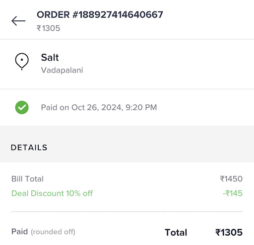 I made a reservation on Swiggy Dineout for 8:30 PM on 26/10/2024 at SALT Nexus, Vijaya Forum Mall, Chennai, for myself and my fiancée. We were guided to our table, chatted for a while, and then placed our orders. We ordered the following: Masala Papad, Bombay Fried Chicken, Paneer Butter Masala (we asked the staff to replace Soya Chaap with Paneer), and two Tandoori rotis.