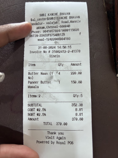 Read moreVegetarian restaurant. Not Air Conditioner. The atmosphere & food taste is okay. I have gone for lunch but I have gone beyond the lunch time. Thank god they had meals at that time and i ordered Special Meals. Sorry to say nothing is special in it. Chappati with very average kuruma and got a small cup of ice cream which is specialized. Actually the taste is okay and was edible too but I was totally shocked after getting the check. 210rs for a meal in a non AC restaurant that too in the outskirts isn't fair. I had lunches in 60rs as well as for 1750rs - But in general what the consumer will check is whether the food is worth for the cost or not. Here it isn't....