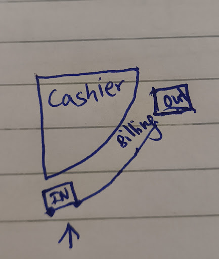 I'd suggest only one way IN and other way Out, so that people can't jump queues. Billing for both parcels and Dine-In should be at the same entry, that way it will be simpler and not bunching up in front of cashier.