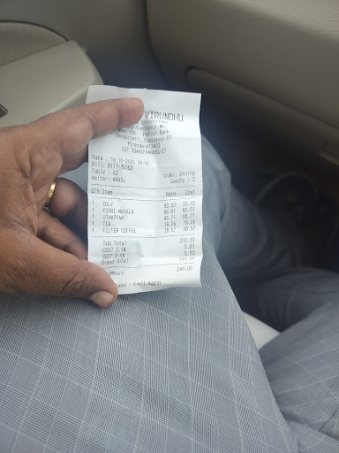 Read moreToday we saw the board en route towards Tanjore and Trichy, stating Mini Tiffen, but after reaching Vasantha Virundhu, restaurant person mentioned that, there no vada today, so we withheld Mini Tiffen, still we a breakfast there, breakfast is ok, ch, hygiene is ok, when I asked for a cup coffee, waiter said he will check and come he said ok for coffee, I ordered a strong coffee, but the coffee is fully milky, then I felt that, from starting itself everything is a bluff, so the sign board for mini Tiffen is a trap, mini Tiffen combo is 69 now I have paid 245 for 1 plate of idly, 1 plate poori and 1 dosa, price is too...