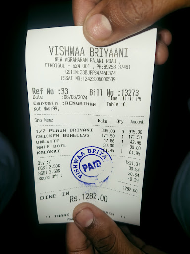 Read moreOn 14th September i visited this restaurant as pery friend Mr. Saravanan proff of NPR college. Ambience excellent Service superb Staffs all trained AC good But briyani totally disappointed Waste of money No difference or unique taste in this restaurant Almost all restaurants in Dindigul offer the same taste of briyani except 2 restaurants i don't want to mention the name here. Kindly visit Madurai and taste some some restaurant briyani. Very very costly your briyani and the chicken I ordered bone less was half cooked. The egg briyani half plate rate is Rs, 400/- it is not a 3 or 5 star hotel it is a AC restaurant only why toooooooo much of cost not good for business