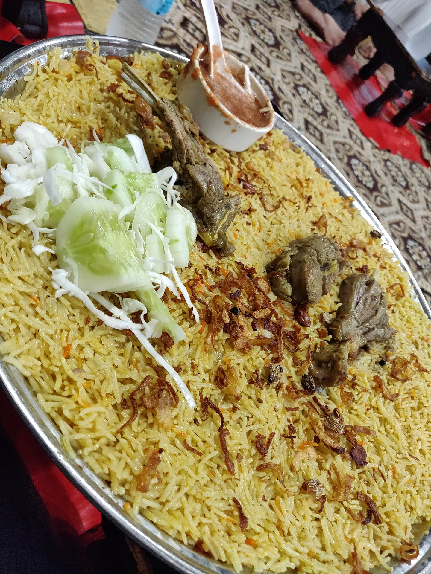 Read moreThe seating was comfortable, although there were no hard arm Pillows. There are 3 sections for seating, family section with carpet, general section with carpet and another general section with tables and chairs. They served hot soup just as we settled down. The soup was hot and titillating appetizer. We ordered Mandi while having the soup and by the time we finished the soup Mandi was served. Quick service. The Mandi was hot when it was served and the mutton was steamed and tender. But the way the rice was spread in the plate, the rice gets cold and dry really soon. I would suggest that they serve the rice as an inverted bowl on the plate, which would keep the rice hot for longer time. Apart from that, the taste was satisfactory and the mayonnaise and the tomato chutney was a good company. They offer sweety sweety...