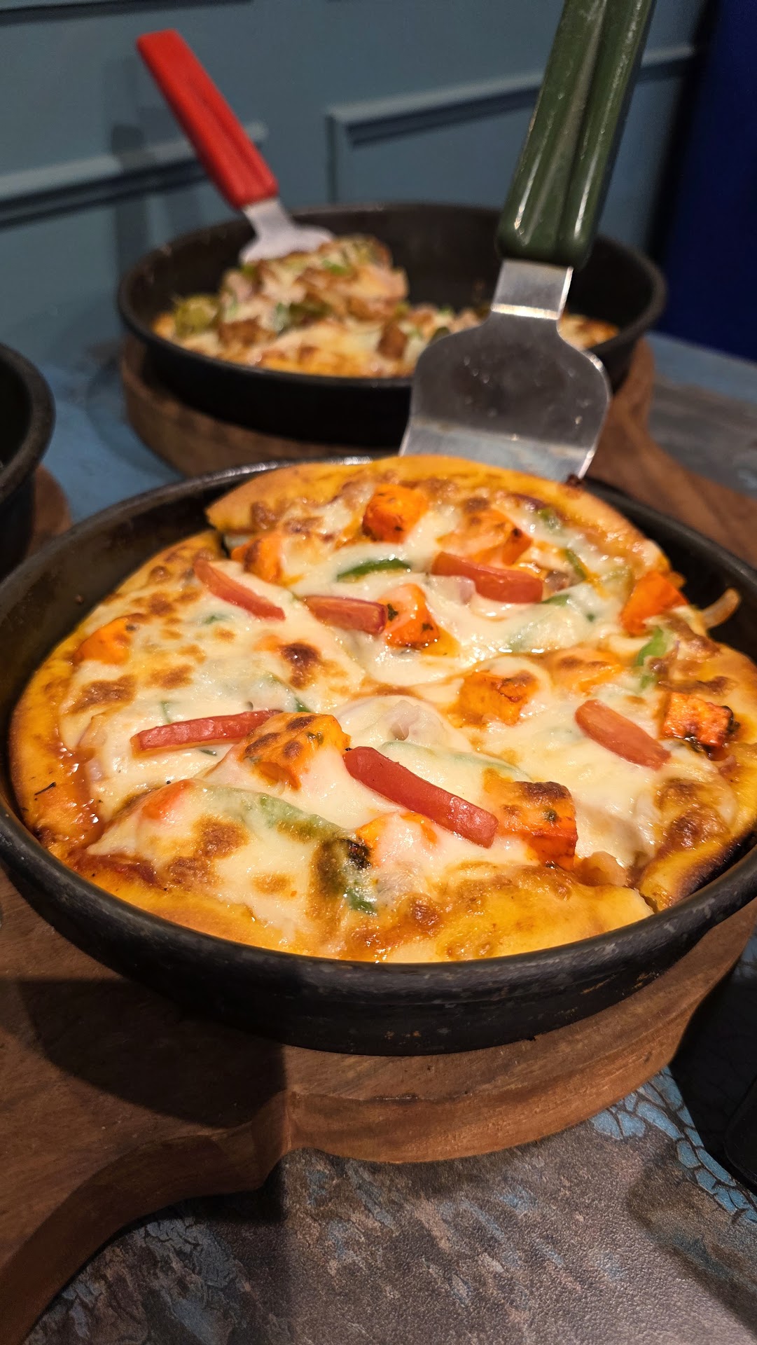 Once seated, I sampled a variety of items from their menu. The Cheese Burst Chicken Pizza stood out with its generous layers of molten cheese and well-seasoned chicken, making it a delightfully indulgent choice. The Stuffed Chicken Pepperoni Garlic Bread was another highlight — crispy on the outside, packed with flavor, and served warm with a satisfying cheese pull.