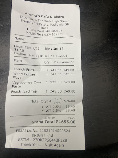 Ā Ā Ā Read moreWhen I think for a place to meet someone the first thing comes in my mind is coffee shop.. Aromas is one the beautiful and my all time favorite restaurant.. . . This outlet of is located at thane Hiranandani estate to be specific at The Walk.. The ambience was cozy with amazing music . . So I visited this outlet to meet one of my friend on Wednesday afternoon.. being Wednesday afternoon the place was quiet busy.. The best part was being such a busy place the service wasn't affected at all.. . . Here's what we ordered - . *Nutela Hazelnut coffee :- new flavor I had tried in coffee.. it was a perfect cup of coffee with Nutella at bottom and nicely brewed foamy coffee on top.. served with a cookie.. . *Mixed berry shake :- A cold shake and me being a berry lover this was heavenly . *Jalapeno Nuggets :- It was cylinderical shaped jalepeno nuggets deep fried and with lots of cheese served with mayo dip.. Definitely something you should try . Veg Quesadillas :- Quesadillas are all time favourite.. But just felt it was quite different from Quesidilas I had it somewhere else it was not upto the mark but yes it was good.. It was served with salsa and sour cream.. . *Aromas own pasta :- Definitely its worth ordering.. It was made in pink sauce.. The taste was so good I can still feel the taste in my mouth every bite of this was lipsmacking.. . *Mousse shot :- A chocolate mousse served in a glass of shots. This was definitely the best shots I ever had..š . . Would definitely like to take a moment and thanks Ranjit for his great service and for making our visit memorable.. The food was good.. Service was great.. A total worth visiting place it...