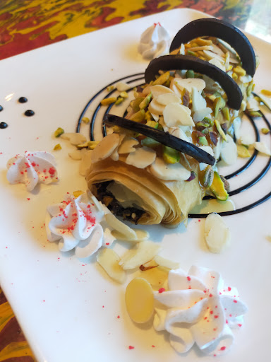 The signature dessert, Hazelnut pistachio baklava - Crispy layers of baklava soaked with sugar syrup, prepared with butter. Dark chocolate stuffed inside along with pistachio. This hot crispy dessert is one of my favourite.