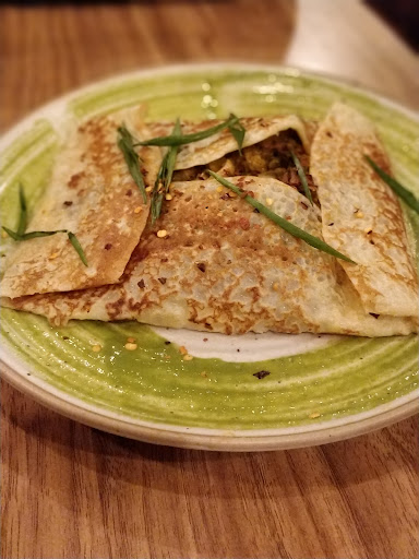 SAVOURY CREPES ⭐️ Verdura - The dilemma was real when it came to choose Crepes. Mr.Thomas was quick to suggest us . As we’re vegetarians he suggested to head with ‘Verdura’ to which we nodded a yes . And viola ! He didn’t disappoint us . There are 2 option to choose the crepe batter ... Classic (made up of Refined flour , WWFlour , Milk etc) Another one is Buckwheat Flour (buckwheat aka kuttu in hindi , water and salt and yeah it’s glutton free😉) We chose buckwheat one of course . Crepe was made to utter perfection just the right amount of thickness . It had an finger licking delicious filling of brocolli , sautéed onion , zucchini , baby corn , cream cheese , bell peppers accompanied with balsamic dressing , greens and sour cream . What a lovely wholesome dish it was . Highly Recommended !!