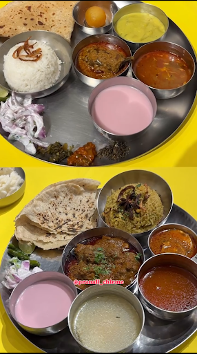 Non-Vegetarian Thali: For those who enjoy non-vegetarian fare, the non-veg thali is a must-try. The Kolhapuri Chicken and Mutton Rassa are standout dishes, prepared with a perfect blend of spices that give them a fiery kick. The succulent Kombdi Vade (chicken fritters) and Mutton Sukka (dry mutton curry) are also highlights, offering rich flavors and textures. Paired with fluffy Jowar Bhakris or Chapatis, and served with refreshing sides and traditional accompaniments, this thali is a complete indulgence.