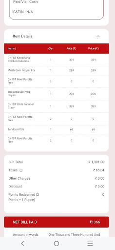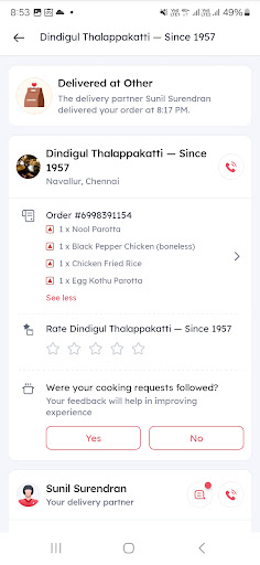 Read moreI bought 4 items from Dindigul Thalapakatti in Navalur branch at 7.30 pm today Fried rice, black pepper chicken boneless, kothu parotta, nool parotta, etc. When I opened the black pepper chicken, I smelled a foul smell After that, I thought I would have something else to eat and took it to my mouth. It was very stinky. It was about 5 days. I think it was contaminated. The chicken was destroyed. It was very stinky. I could not take it to my mouth or nose. If I call the person in that branch, he will not give me a proper response. Okay? I did not ask anything. I asked him to take his food and give me money. Because I regularly I am disappointed that I could not get a quality food for my customers. I have forwarded this to the food safety department and I am planning to submit this to the CM cell. I have taken samples of all the food items. I am not getting any compensation for this. I am going to take the food as per the law. ok? Even if I don't get this money, it's ok ok? I will think of begging for a branch in Navalur wearing a Dindigul...