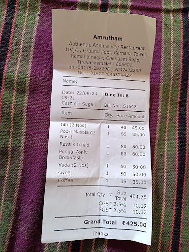 Read moreWe recently stayed for a week at Ramana Towers and dined in the restaurant . Our experience is good . The service we have experienced is good ,thanks to the young team and the girl Ms. Sangeetha , and one more girl name not remembering who also extended good service , one more young boy . They are trying hard to manage the crowd . Food whatever we ordered were mostly north indian dishes and taste was good /decent . We did not order Andhra food . The dinner was always good . No mistakes . Tiruvannamalai is a pilgrim place and main focus is on God Arunachala and for spiritual purpose . It is not a holiday paradise . We need to keep this in our mind . The crowd is un controllable at times (especially weekend) and full moon days in many restaurants and the quality suffer some times . Even in Anand Ramana the crowd is un manageable and waiting time is more . Here in Amrutham the space is small and inflow of crowd is more due to Ramana towers and their in-house guests . The supervisor and other support staff arw also doing their best . What else you can expect in a most crowsed spiritual place like TIruvannamali ?, Arunachalam is our main focus and food is not a primary reason to visit . We also understood the pressure on the staff and cooperated , finally they are also human and with limitations . I don't know the management team of Amrutham but recommend to reward the staff As they are doing their best . Keep training the and motivating them . Advise the management team regularly interact with guest and understand resolve issues if and...