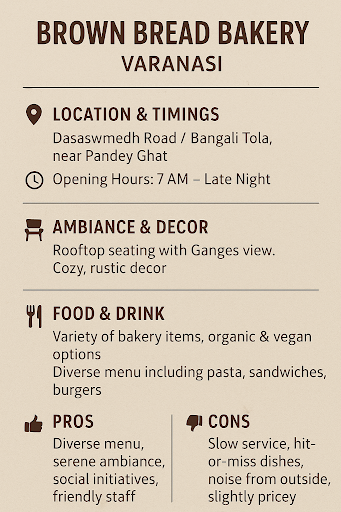 Brown Bread Bakery in Varanasi is not just a cafe; it's an experience that begins long before you step inside. This review is for those who are prepared for the pilgrimage to find this hidden gem, as it is a place of stark contrasts—the challenging, grimy exterior gives way to a charming, welcoming interior. The Journey In: A Test of Resolve Be forewarned: reaching Brown Bread Bakery is an adventure in itself, and a navigation app can only get you so far. Tucked away in the dense, narrow, and often confusing lanes of the Bangali Tola area, it is completely inaccessible to any kind of vehicle. My cab driver dropped me off a good 500 meters away without any prior warning, leaving me to navigate the labyrinthine alleyways on my own. The streets leading to the bakery are a significant deterrent—unhygienic, cluttered, and with a distinct feeling of being unsafe, especially for first-time visitors. The initial impression of the cafe itself, a small and unassuming entrance, does little to inspire confidence. The First Impression: A Hidden Oasis However, the moment you pass through the doorway, the entire narrative shifts. The atmosphere inside is a complete and utter transformation from the streets outside. The ground-floor cafe is cozy and modest, but the real star is the rooftop restaurant. Climbing the stairs, you are rewarded with a breathtaking view of the holy Ganga, a perfect backdrop for a meal or a moment of reflection. The ambiance here is serene and inviting, a true oasis from the city's chaotic energy. Adding to the charm is the knowledge that this establishment is part of a social enterprise, supporting vocational training for local underprivileged individuals—a wonderful cause that makes every purchase feel more meaningful. The Culinary Experience: Hits and Misses My food experience at Brown Bread Bakery was a mixed bag, with some items being absolutely stellar and others falling short of expectations. The Best of the Best: The coffee is nothing short of amazing. Rich, aromatic, and expertly brewed, it was the perfect remedy after the arduous journey. This is a must-have for any visitor. The garlic bread was another standout. It was perfectly toasted, generously slathered with flavorful garlic, and had a satisfying crispiness that made it a sheer delight. The Breads and Sandwiches: This is where the bakery's performance was a bit disappointing, especially considering its name. While the sandwich itself was "okay," the bread used was noticeably stale. Similarly, the specially-made breads, which one would expect to be their signature, were a little chewy and lacked the freshness and soft texture that fresh bread should have. This was a clear miss and something that could be easily improved. Service and Staff: A Resounding Success Despite the mixed food quality, the one consistent positive throughout my visit was the staff. They were incredibly nice, friendly, and welcoming from the moment I arrived. Their helpful demeanor and genuine warmth made the experience pleasant and welcoming. Their service was prompt, and they were happy to answer any questions, which is a significant plus in an environment that might feel alien to a foreign traveler. Final Verdict Brown Bread Bakery is a place that requires effort to reach, and it’s a place that will challenge your initial perceptions. The journey is difficult, the surroundings are not ideal, and the quality of their namesake breads is inconsistent. However, the reward is a beautiful rooftop view, a truly fantastic cup of coffee, and some of the best garlic bread you'll ever have. Most importantly, you are met with the genuine kindness of a staff that makes you feel at home. It’s a hidden gem, and while it may not be perfect, it is a cafe with heart. If you are prepared to look past the challenges and are looking for a unique, authentic experience with an incredible cup of joe, Brown Bread Bakery is well...