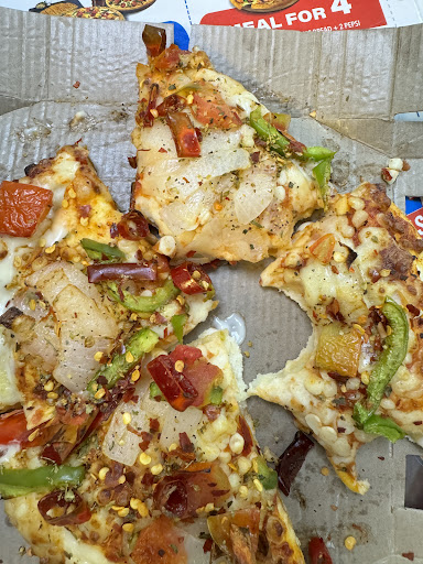 Read moreTastiest pizza with wide variety and great taste home delivery and dine in facility available.The Domino's menu varies by region. The current Domino's menu in the United States features a variety of Italian-American main and side dishes. Pizza is the primary focus, with traditional, specialty, and custom pizzas available in a variety of crust styles and toppings. In 2011, Domino's launched artisan-style pizzas. Additional entrees include pasta, bread bowls, and oven-baked sandwiches. The menu offers chicken and bread sides, as well as beverages and desserts.In August 2012, Domino's Pizza changed their name to simply Domino's. At the same time, Domino's introduced a new logo that removed the blue rectangle and text under the domino in the logo, and changed the formerly all-red domino to be blue on the side with two dots and red on the side with one dot.55 This was done because the company wanted to "expand" menu choices rather than simply rely on their traditional pizza.Domino's tapped into a market trend toward bite-size foods with spicy Buffalo Chicken Kickers, as an alternative to Buffalo Wings, in August 2002. The breaded, baked, white-meat fillets, similar to chicken fingers, are packaged in a custom-designed box with two types of sauce to "heat up" and "cool down"...