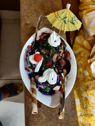 We ordered divorce party (this is tripple Sundae which comes with dark chocolate, black current and American nuts as per menu). First they serve two Sundae (jafrani nuts and vanilla) when we told him that was not our order, they served with tripple sundae( normal chocolate, black current and vanilla). They put truti fruti and choco chips over it.