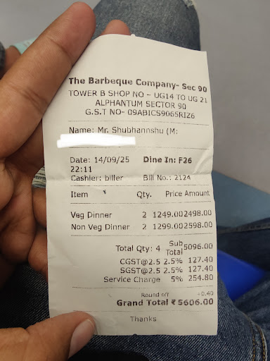 Read moreI would like to share my BBQ Sector 90 experience. We reserved a table for four in advance and went there for dinner as a family. We informed them that it was a birthday celebration once we arrived, and then we began to eat. They gradually slowdown serving and constantly inquired as to whether they should bring anything. It made us feel awkward but we stopped the Grill items and chose to begin the main course because, despite our requests, they were quite slow. After few mins the waiter abruptly arrived and demanded payment. I said "I'm not done eating," I will pay the bill once I finished eating but he said you can continue to eat, but just pay the bill now. Since it's the weekend, I pay the bill and notice that things are getting crowded there.