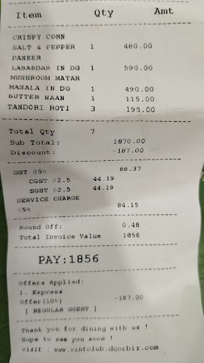 I wished to comment about the wonderful food, service and ambience. Almost everything was perfect until we came to pay the bill. So earlier when I booked our reservation in Vint Club via Zomato, I had to pay ₹75 as redeemable cover charges for my booking.