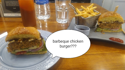 the bad: • the burger patty was of generic type. stuff minced together into a tasteless, sloppy mass of something. don't know if it even contained chicken or if they had to.get rid of some veg patties before they expire... the bill said what I ordered. maybe someone from the management will be able to identity what it's supposed to be. saying barbeque chicken Burger I expected a piece of barbecued chicken meat....