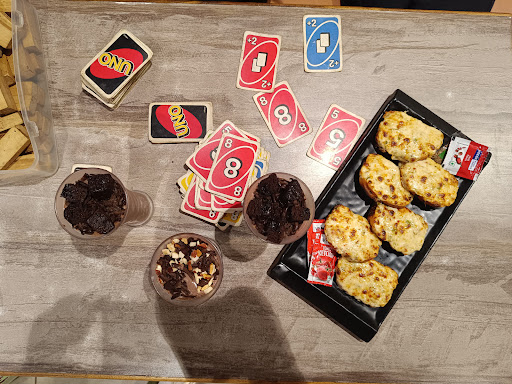 Good food and an even better experience! The garlic bread and hot chocolate are absolutely delicious — a must-try for anyone visiting. The flavors were rich, fresh, and perfectly balanced, making every bite worth the price. The cozy ambiance, warm service, and fun vibe added so much to the overall experience. Playing Jenga while enjoying such tasty food made the time spent here memorable and full of laughter. Definitely a place I’d love to visit again with friends or family for a relaxed and...