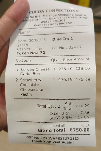 Read moreI recently visited Cocoa Confections in Virar, and it was an absolute delight! The variety of desserts they offer is incredible, and everything I tried was top-notch. The cakes are moist, flavorful, and beautifully designed – you can tell they put a lot of care into their work. I absolutely loved their cheesecakes; they were rich and creamy, just perfect.