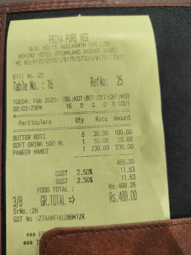 In terms of pricing, Hotel Priya Pure Veg offers good value for money. The portions were generous, and the prices were reasonable, considering the quality and taste of the food. It's a restaurant that offers a satisfying vegetarian dining experience without breaking the bank.