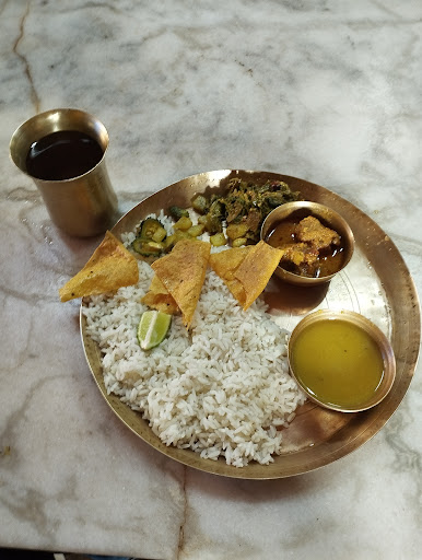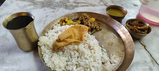 They serves unlimited veg meal (rice, dal, 2 types of sabzi, bhaja / fries, fried papad, chatni and payesh / kheer) that too without onion and garlic. Meals are served on brass utensils. Price of a meal is Rs.60/-. Meals are served only during day time (10am - 3pm). It is served on the 1st floor of the outlet. They also serves tea downstairs throughout the day. Owner and staffs are very polite.