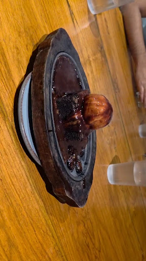 b. Sizzling chocolate brownie with vanilla soup (1 star): ₹180 Nonsense dish. Not sure where the vanilla was as I just saw chocolates all over. Brownie was very bad in taste, too bitter to eat and the chocolate syrup was feeling like hot boiling soup as it was thrown all over the sizzler.
