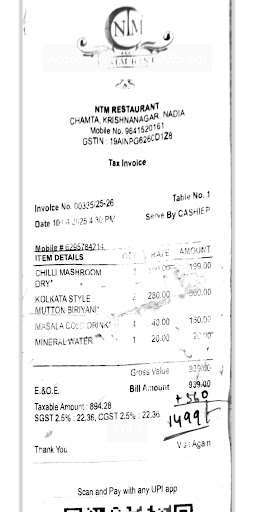 Yesterday afternoon, four of us visited NTM Restaurant with high hopes, but the experience turned out to be deeply disappointing. We ordered chili mushroom and four Kolkata-style mutton biryanis. While the chili mushroom was a bit too salty, the mutton biryani initially seemed fine.