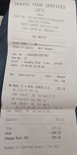 My experience at the Subway restaurant in Kolkata Airport was a satisfying one. As a traveler, finding a familiar and healthy dining option is often a relief, and Subway delivered on that front.