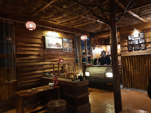 A board inviting us to "get warm in the fire inside" is what drew us to this place in the freezing year end evening. While we had trouble finding the entrance, we soon solved the conundrum and made our way into this offbeat log cabin with incandescent lights and a lone person rubbing his hands over a can of burning coal. An improvised chimney was made of a smaller tin can. This person was the one managing, the cash counter, the kitchen and the tables. He greeted us and mouthed a limited menu as the menu cards weren't back from printing. The cafe had just started a few days back. As the person took our order and went into the kitchen to make it we took to the promised fire. A LED TV playing out bollywood numbers from spotify through a speaker in full volume was the only element of modernity in a decor dominated by bamboo walls, bamboo mat roofs, unevenly cut wooden slab desks, black and white/sepia photographs of old artists, an acoustic guitar, an old dial phone and most interestingly a Maruti omni front fascia for the cash counter.
