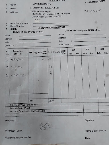 When ever i go chennai i used to go to kfc near cbmt but last time on my reacent visit to chennai to visit a friend i went to KFC at ashok nagar recently and ordered 8pice buket . Really liked the fiery grilled chicken while found the popcorn too bland for my taste. but the chicken us not drained properly and oily. But smoke grill pices will be good as sauce on it is spicy and tastes good with less oil or no oil on it.