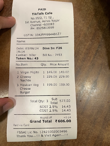 The nachos appeared to be supermarket quality, merely drizzled with cheese sauce. For the price, I expected freshly made nacho chips with a proper cheese dip. The virgin mojito was very bland, with flat soda and a taste akin to plain lemon water. The burger was just tolerable. Burger King provides much tastier burger than this bland and dry burger. And I had a peek inside the kitchen. Saw a guy tasting a drink with spoon and dipping the same spoon in the drink. Absolute worse.