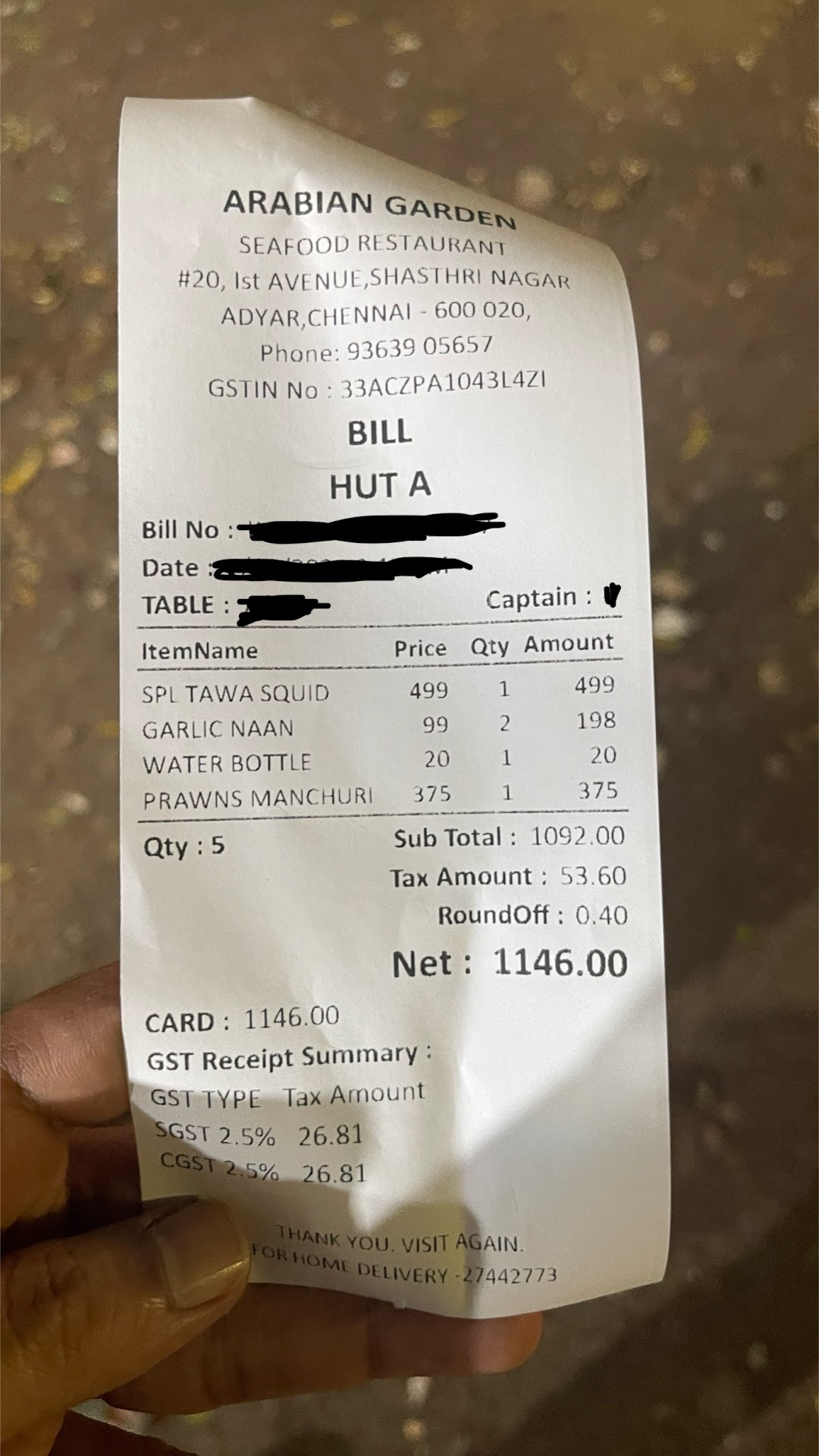 The price of the items have increased drastically equivalent to a high -end fine dinning restaurant. I ordered tawa squid, golden fried prawns and butter garlic crab and mosambi juice. The squid was clearly very chewy (a sign of being old) to the point even deep frying couldn't save it and the quantity was very less. I have seen no restaurant serve such small prawns for Rs. 500. Finally, the size of the crab has diminished to half the size and was double the price from last time. However, even with such hike, the crab was clearly very old and didn't feel good quality at all.