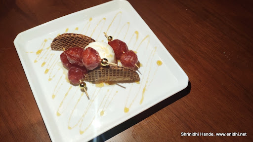 The evening came to an end with good old curd rice, served with potato fry. Has two deserts-burfi cake and mithai skewers- vanila ice cream served with kadalekai mithai and honey candy.