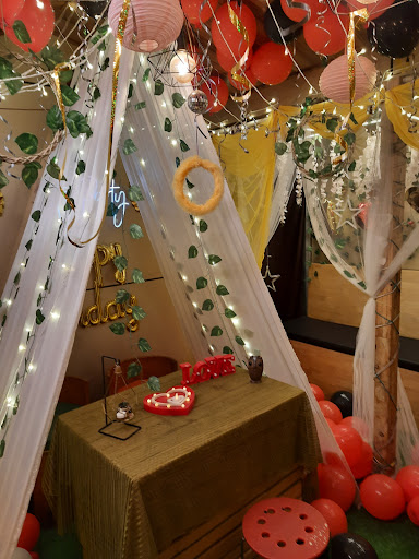 The balloon decorations were nice, but we noticed there was only a boy-themed air-filled baby doll and no girl-themed one. Additionally, none of the table or side lamps were operational. The air conditioning, despite being on, provided no coolness. We were told this was due to the heat outside, but even after 1.5 hours, the AC produced only warm air. We had to rely on a table fan provided.