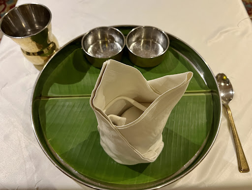 The main courses then came all at once, beautifully plated on traditional dining vessels, and included three different meat/seafood curries: Kori Gassi (dark meat chicken in a tomato gravy); Yera Thokku (baby prawns with tomatoes and peppers); and Mutton Chettinad (bone-in mutton in a peppery gravy). There was also Poriyal (chopped gourd); Kai Kurma (coconut-based curry with mixed vegetables); yellow dal; Kathrikai Murungakai Kara Kozhambu (a tangy soup with drumstick and eggplant); curd; Chitrannam (curry leaf-flavored green rice dish); Idiyappam (string hoppers made with rice); and Veechu Parotta (layered flatbread). Everything on the thali was so flavorful and well-balanced, from the spicy curries to the earthy dal to the creamy kurma and cooling curd, but my favorite elements were the crispy parotta and the three meat curries, each of which had a distinct flavor profile. As if all this werenโt enough, lastly came an entirely separate dessert course: a bowl of payasam (a warm coconut pudding) and a scoop of tropical, three-flavored jackfruit/banana/pineapple ice cream. On top of the delicious, beautifully-presented food, the service and atmosphere were on point, and there was even live, traditional South Indian music...